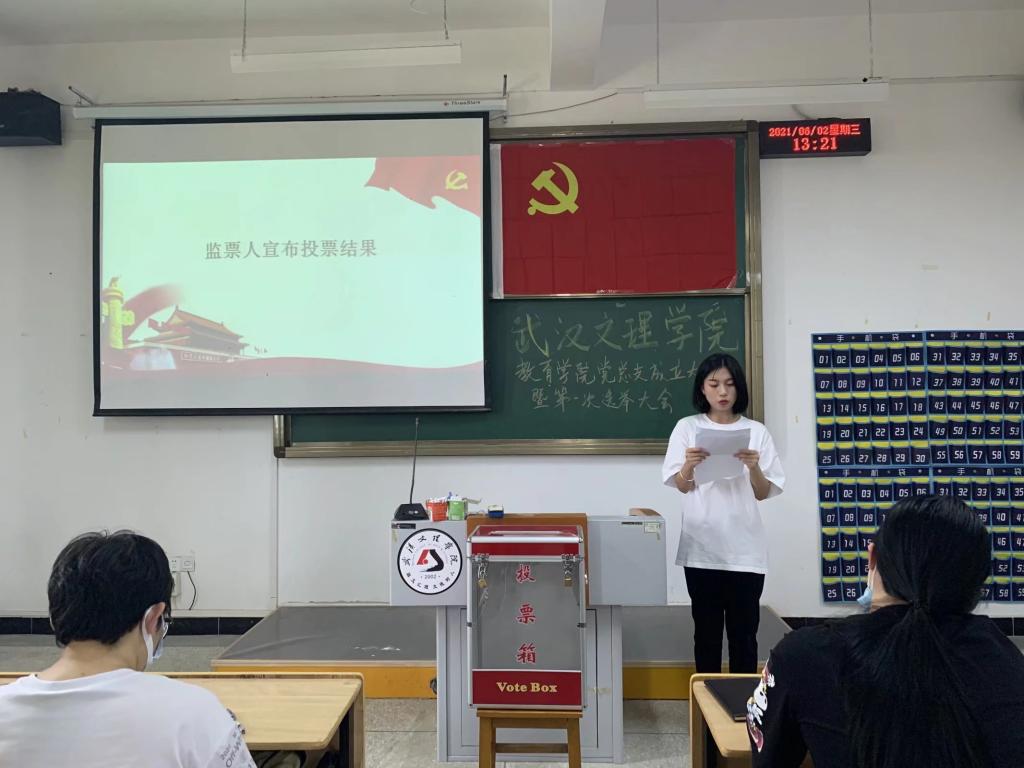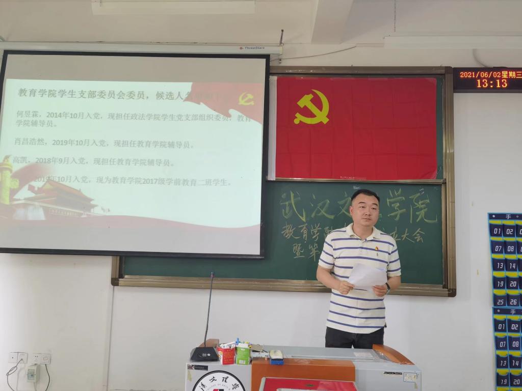 会议在雄壮的国歌声中开幕,刘超同志给全体党员宣读了武文理党〔2021〕5号《关于同意成立388vip太阳集团官网教育公司党总支部的批复》文件。在大会选举环节,经介绍候选人预备人选简历后,根据党章规定,全体党员按照民主、公正、透明的原则,采取无记名投票方式和差额选举办法,选举388vip太阳集团官网教育公司党总支委员会委员、388vip太阳集团教职工党支部委员会委员、388vip太阳集团员工党支部委员会委员。
