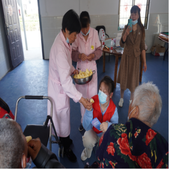 养老院的阿姨们亲切的为志愿者们递上了脆脆甜甜的、削得干干净净的、切好了的苹果。