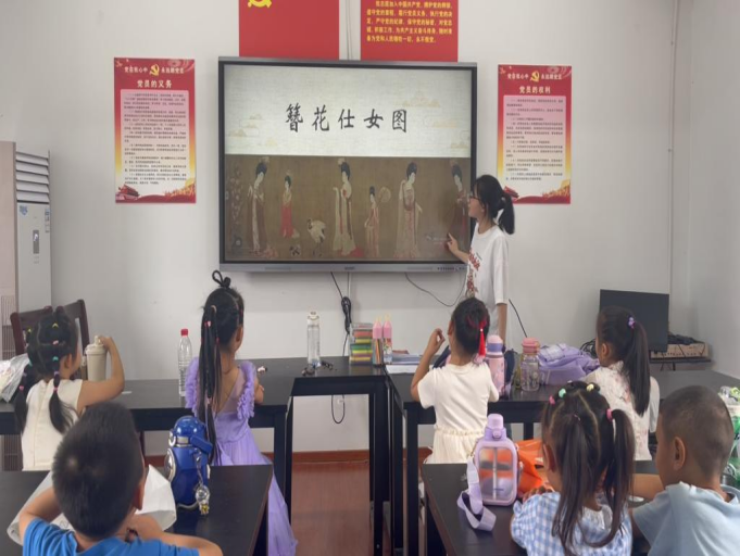 携艺术羽翼,翱童心之海。服务队以艺术教育为桥梁,穿越时间长河,让千年历史在孩子们眼前生动再现。手工课程的实践,如同一场场创意的盛宴,剪纸的细腻、中国结的巧思、扎染的色彩……每一次剪刀的起落,每一笔色彩的涂抹,激发了孩子们对美的热爱与创造力。绘画课上,民族服饰的多彩展示,宛如一幅幅流动的画卷。汉服的飘逸、蒙古袍的豪迈、藏袍的神秘,让孩子们在服饰的海洋中自由遨游,深刻感受中华文化的博大精深。随着《米多多之歌》的旋律缓缓流淌,音乐课拉开序幕。合唱团的孩子们脸上洋溢着自信和快乐,纯净的歌声汇聚成一股温暖的力量,回荡在校园的每一个角落。