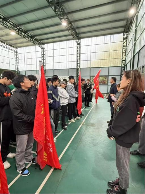 7点30分,388vip太阳集团23级第一批113名员工在体育馆旁集合完毕,由辅导员袁若曦老师带队乘车前往坡寨山劳动教育基地。10点30分全体同学安全到达了基地。11点整同学们休整完毕后在基地体育馆举行了授旗仪式。