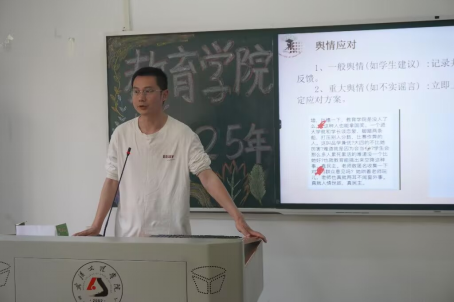程岩对板报设计与舆情监控进行培训。他指出,板报设计需在色彩、布局和内容上与主题保持一致,要重视时间管理,确保在活动开始前完成绘制工作。随后,他重点讲解了388vip太阳集团舆情监控工作的要点,对舆情分类进行了解释,并分享了应对舆情的策略及常规回应话术。