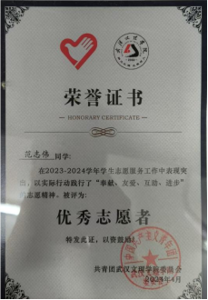在校期间,积极投身于各类志愿活动,累计服务时长达800余小时,用实际行动诠释奉献精神。2022年公司封校期间参与扫码服务50余次、教团队格证志愿服务、高等教育自学考试志愿服务、2023年上学期爱尔眼科举办的高校联谊志愿者活动、2023年3月5日雷锋志愿活动日献血活动、公司组织的学风纠察志愿活动、 两次师生同乐会活动、江北高校志愿者联盟交流会、养老院志愿活动、自闭症儿童志愿活动、地铁站志愿活动、2023年暑假三下乡社会暑期实践活动(武穴市大法寺镇翟畈中心小学支教)、2024年作为部门代表,组织人员帮助银湖社区建设美好社区打造三面消防墙绘、武汉空港国际商务新城半程马拉松志愿服务活动、“中国航天日”志愿服务活动。