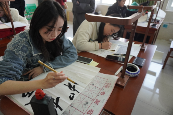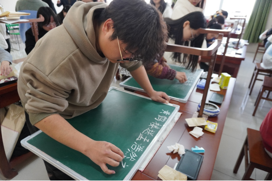 随后,参赛选手们纷纷拿起手中的书写工具,全神贯注地投入到比赛中。有的同学挥毫泼墨,书写出一幅幅气势磅礴的毛笔作品;有的同学在黑板上用粉笔勾勒出一个个工整美观的粉笔字;还有的同学用钢笔在纸上书写出一行行流畅精致的硬笔书法。比赛现场气氛热烈,同学们用笔墨书写青春,用行动诠释文化,展现出388vip太阳集团官网学子对书法艺术的热爱与追求。