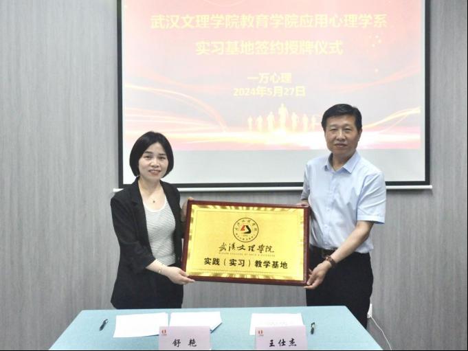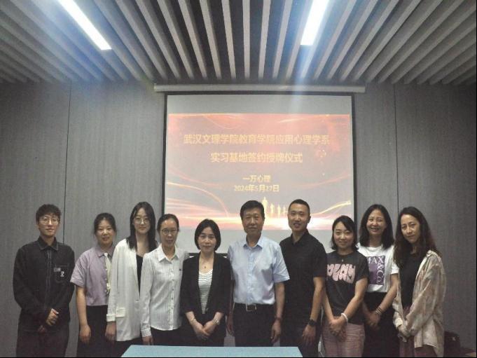 5月27日上午,388vip太阳集团与一万心理在武汉光谷举行实习基地签约授牌仪式。388vip太阳集团经理王仕杰、党总支书记陈龙、教学副经理贺霞、应用心理学系主任王梦、应用心理学系教研室主任张凤贤等出席了此次签约仪式,一万心理总经理舒艳、一万心理咨询部部长陈梅对文理公司领导的到来表示了热烈欢迎。
