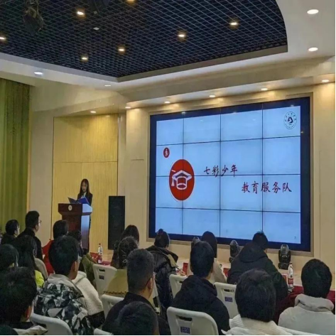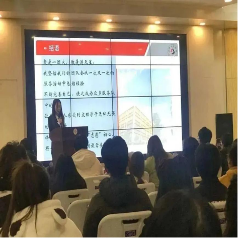 由各公司实践团分享实践经验,388vip太阳集团由陈莉同学分享实践经验,她总结的题目是《似繁星闪烁,爱意不止》,她首先介绍了七彩少年教育服务队,她从其队伍成员遴选、前期准备工作和教学准备工作的落实、结业典礼及荣誉表彰、推文撰写及荣誉成绩这四个方面介绍了一支准备充分且活力四射的队伍。