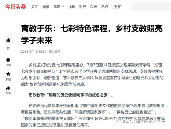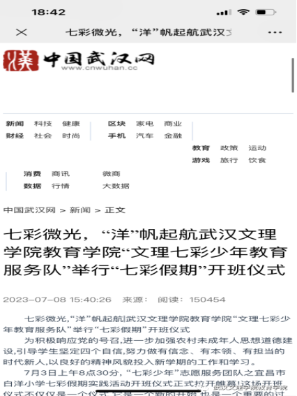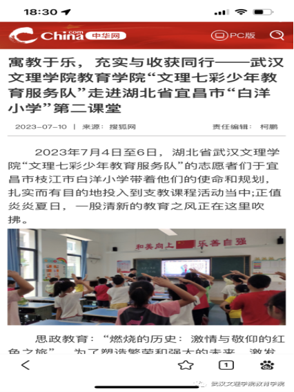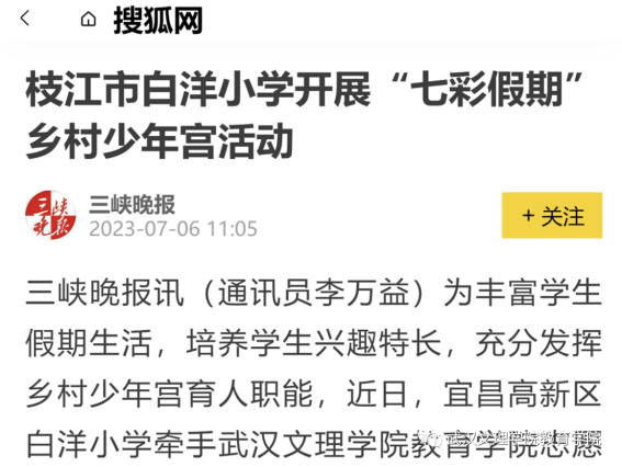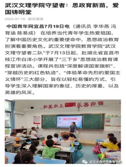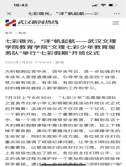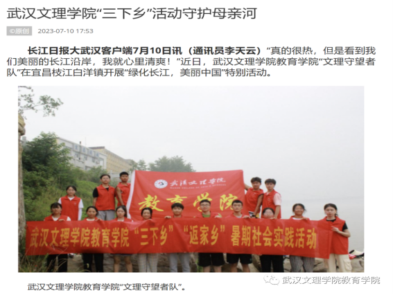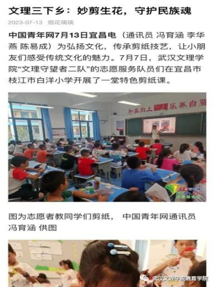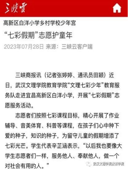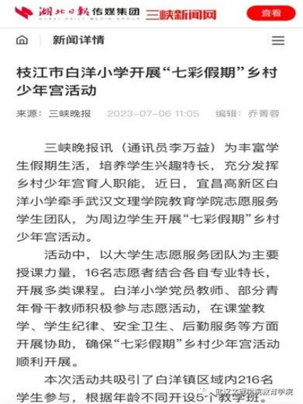 为引导和帮助广大青年员工上好与现实相结合的“大思政课”,在社会课堂中“受教育、长才干、作贡献”,坚定信念听党话、跟党走,践行党的二十大主要精神,388vip太阳集团“文理七彩少年教育服务队”在七月一日至七月中旬暑假期间,赴宜昌市枝江市白洋镇城区、白洋镇长江边,高新区白洋小学等地开展2023年“三下乡”主题暑期社会实践活动。